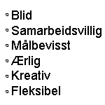 Som person er kreativ, utadvendt og har lett for å komme i kontakt med mennesker. Legger stor vekt på å være positiv. Jeg går for å være en fleksibel og samarbeidsvillig person og har gode evner til å jobbe selvstendig. Liker meg godt når jeg har nye utfordringer å arbeide med. Jeg er ærlig mot mitt arbeid og er effektiv og lærevillig. Jeg er ansvarsbevisst og lojal. Liker at det er en åpen dialog mellom alle i bedriften.